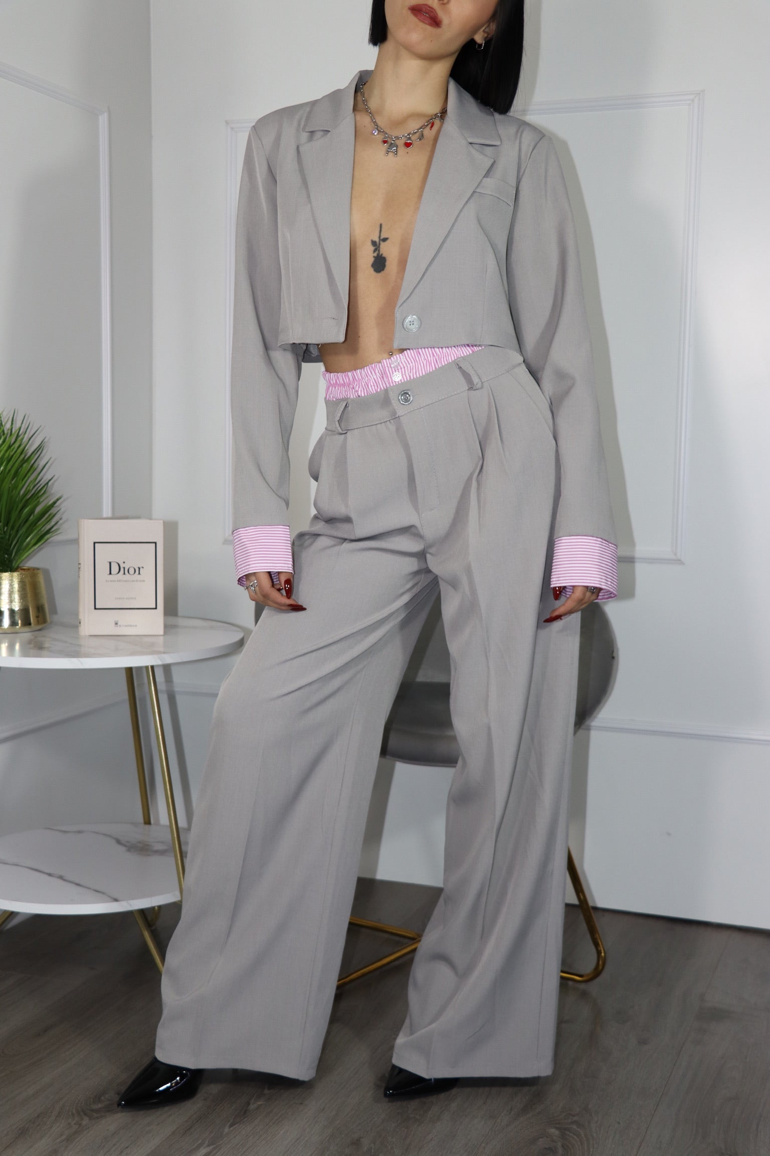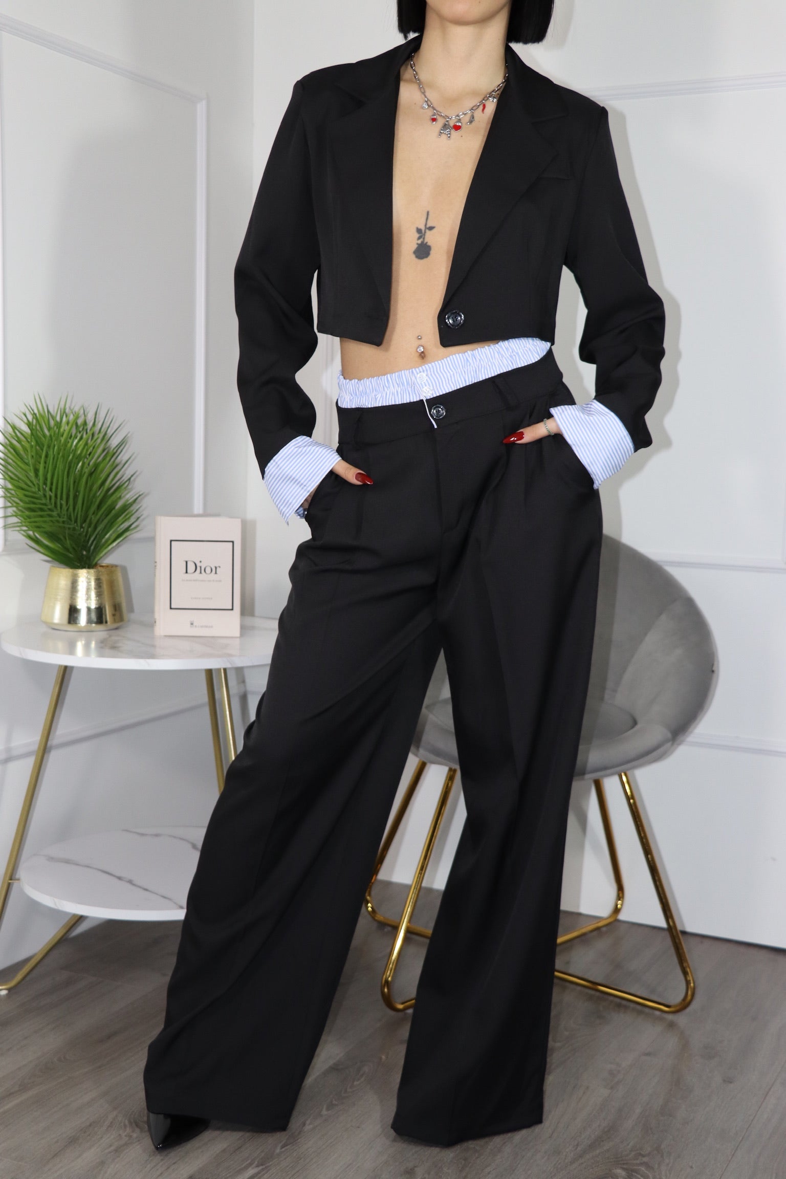 Questo completo gioca con i codici del tailoring classico reinventandoli in chiave audace e contemporanea. È composto da una giacca cropped. Il dettaglio iconico sono i polsini e il bordo interno della vita a righe, ispirati alle camicie tradizionali. I pantaloni hanno una linea fluida, con gamba ampia che slancia la figura e dona movimento. Il taglio è elegante ma rilassato. L’insieme comunica potere, stile e femminilità non convenzionale.