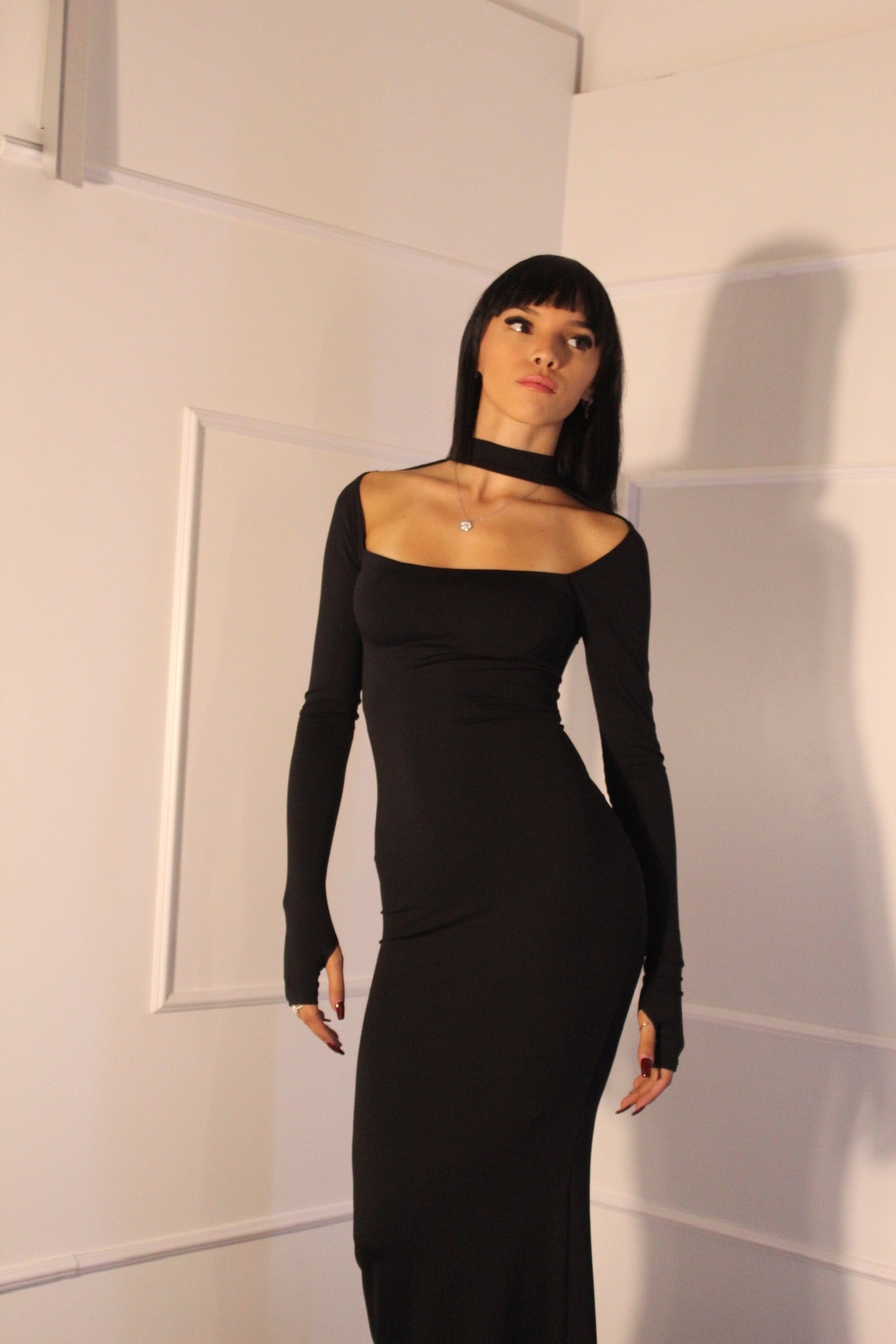 Questo vestito è un abito lungo dal fascino elegante e misterioso. Realizzato in tessuto nero elasticizzato, avvolge la figura con una linea aderente che valorizza le forme in modo raffinato. Le maniche lunghe con apertura per i pollici e la scollatura dritta sulle spalle creano un equilibrio perfetto tra minimalismo e sensualità. Il dettaglio del collarino coordinato aggiunge un tocco di modernità e allure dark, rendendolo ideale per serate sofisticate o eventi speciali.